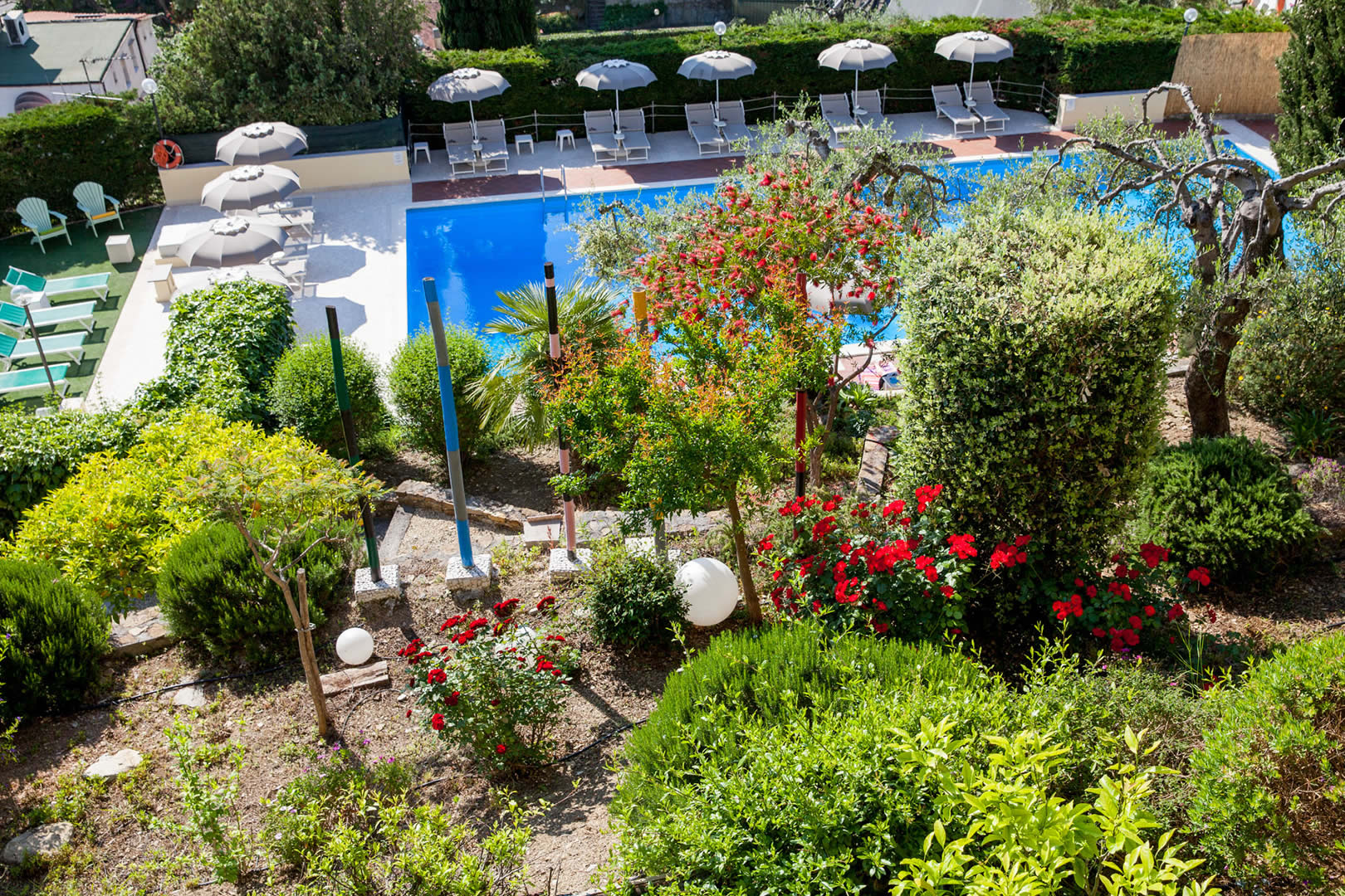 Grazie alle sue ampie dimensioni – 20 metri di lunghezza, 8 metri di larghezza e una profondità massima di 3 metri – la piscina principale è il luogo ideale per rilassanti nuotate e per rigenerarsi sotto il sole.