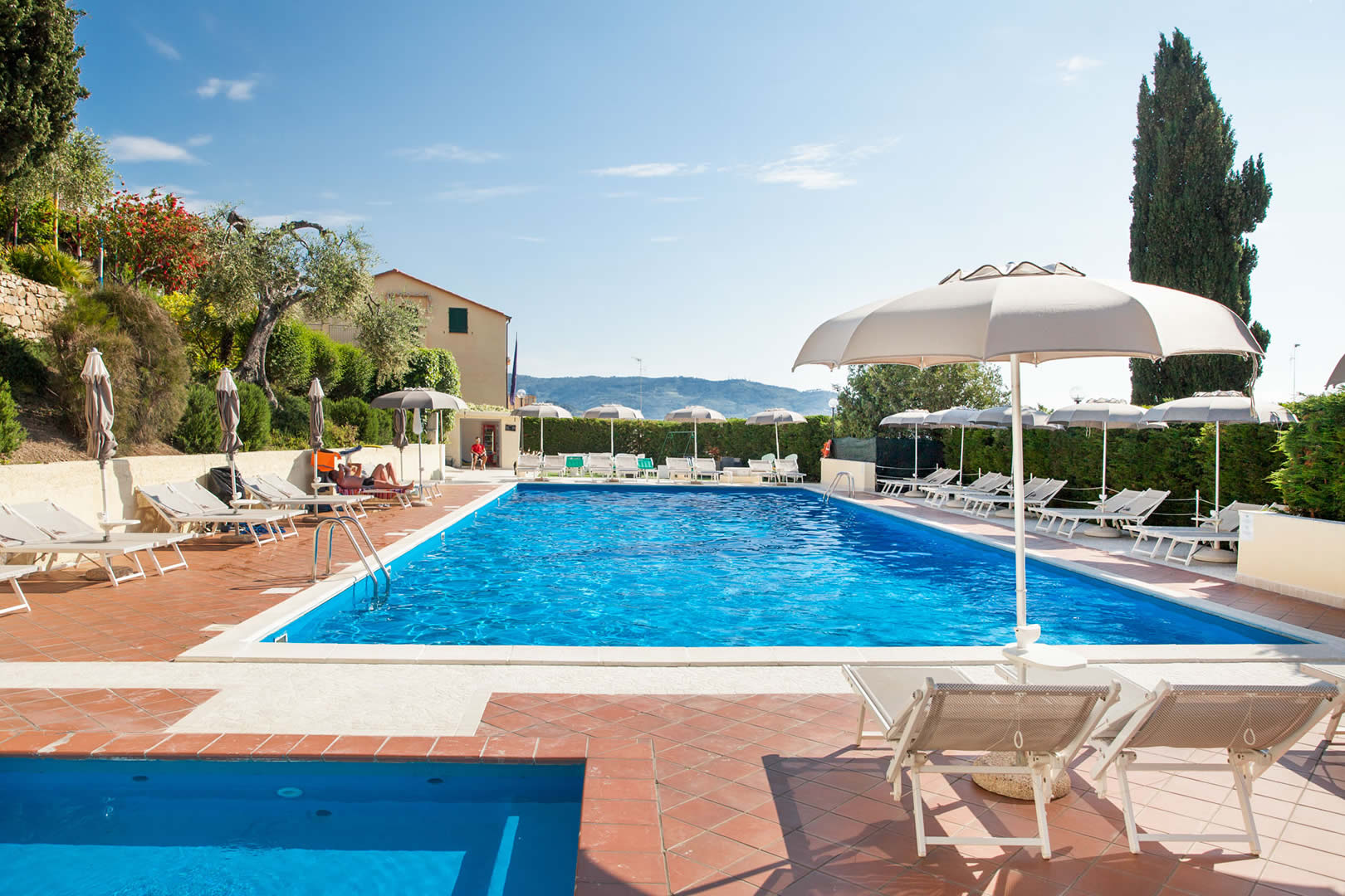 Grazie alle sue ampie dimensioni – 20 metri di lunghezza, 8 metri di larghezza e una profondità massima di 3 metri – la piscina principale è il luogo ideale per rilassanti nuotate e per rigenerarsi sotto il sole.